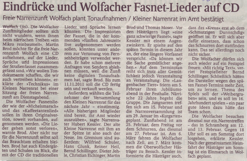 Schwarzwälder Bote 28.10.2010 – Freie Narrenzunft plant Tonaufnahmen / Kleiner Narrenrat im Amt bestätigt