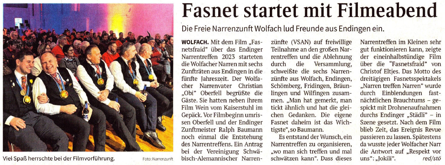 Schwarzwälder Bote 28.01.2025 – Die Freie Narrenzunft Wolfach lud Freunde aus Endingen ein