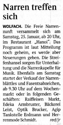 Schwarzwälder Bote 25.01.2025 – Narrenversammlung im „Hanoi“