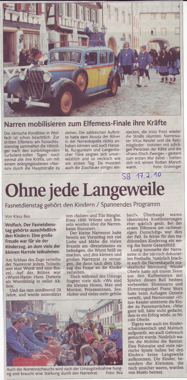 Schwarzwälder Bote 17.02.2010 – Narren mobilisieren zum Elfemess-Finale ihre Kräfte