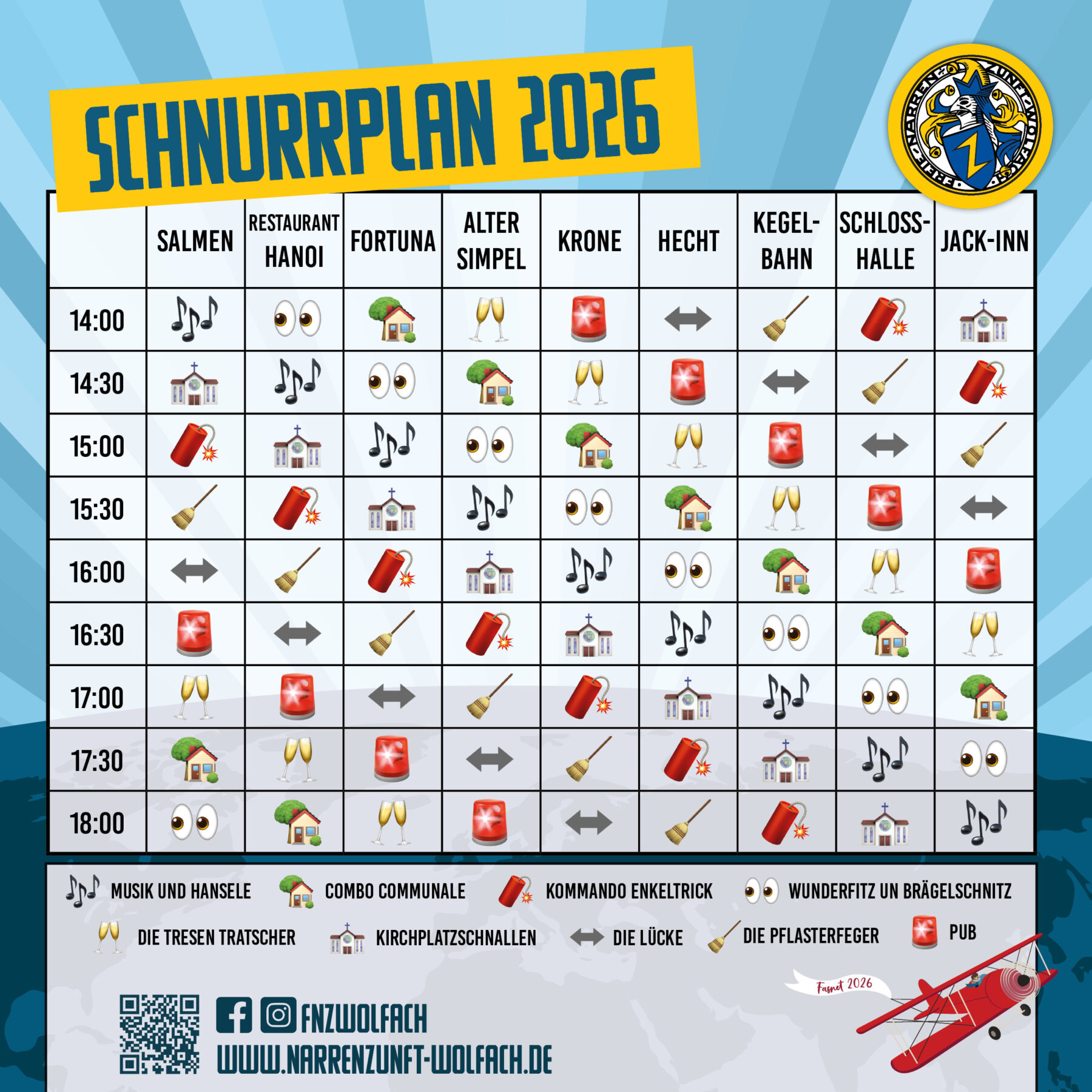 Am Sonntag, 08. Februar findet wieder das traditionelle Schnurren in Wolfach statt. Dieses Jahr setzen zwei Gruppen aus:„Vorstadtbixxen“ und „Die Lückenfüller“. Somit läuft PUB alleine getrennt von der Narrenkappelle – eine Lücke bleibt zum Lachmuskel entspannen und Nachschub ordern. In folgenden Wirtschaften wird geschnurrt: Salmen, Restaurant Hanoi, Fortuna, Krone, Hecht, Schlosshalle, Alten Simpel, Jack-Inn und Kegelbahn.