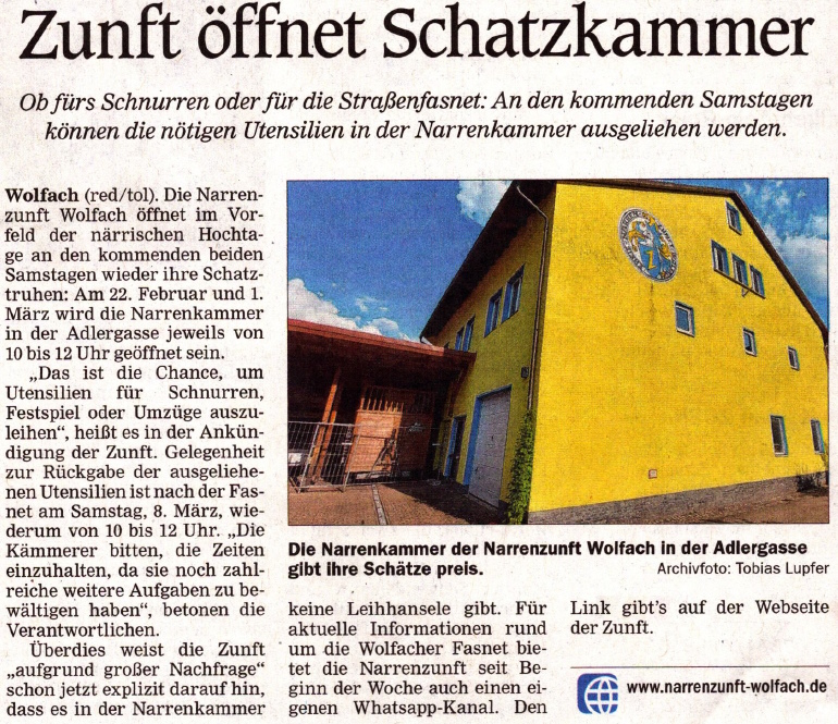 Offenburger Tageblatt 15.02.2025 – Öffnungszeiten der Narrenkammer